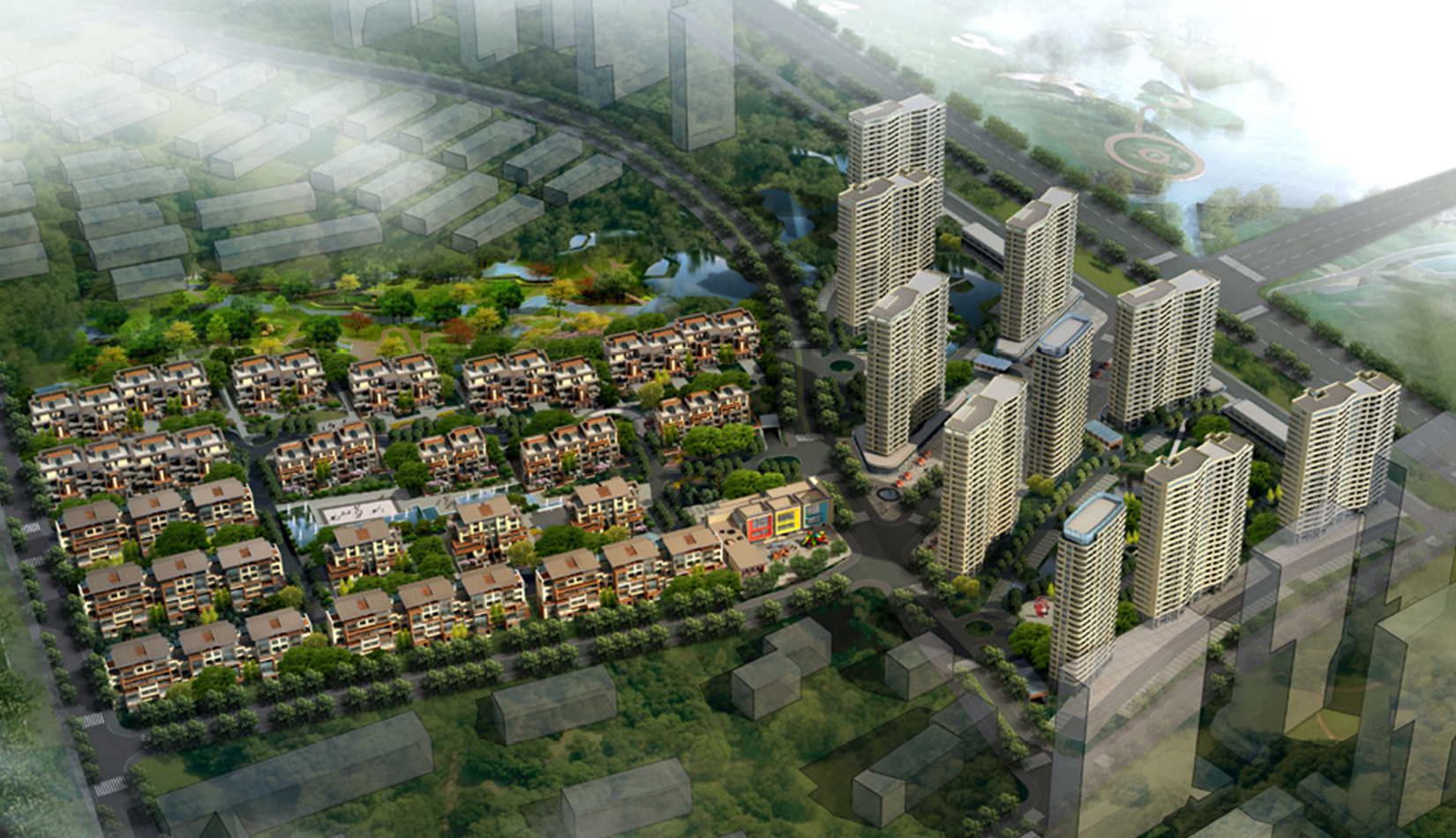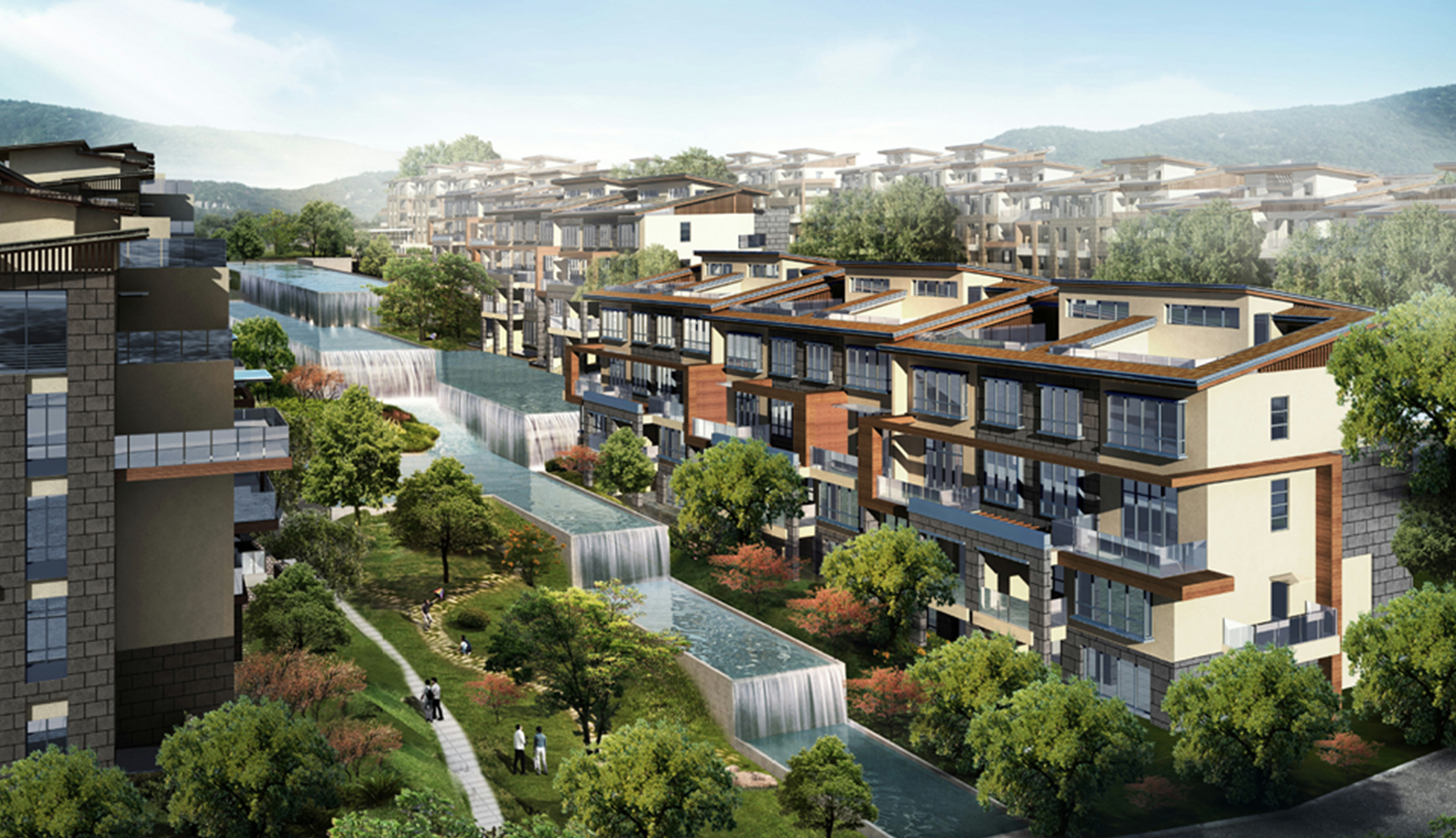 在總體的規(guī)劃設計中,設計師的靈感主要來源于項目中現(xiàn)存的分布于場地中央和南北地塊的數(shù)處面積不大但卻別具自然風情的水體和山頂雨水沖刷所形成的沖溝。