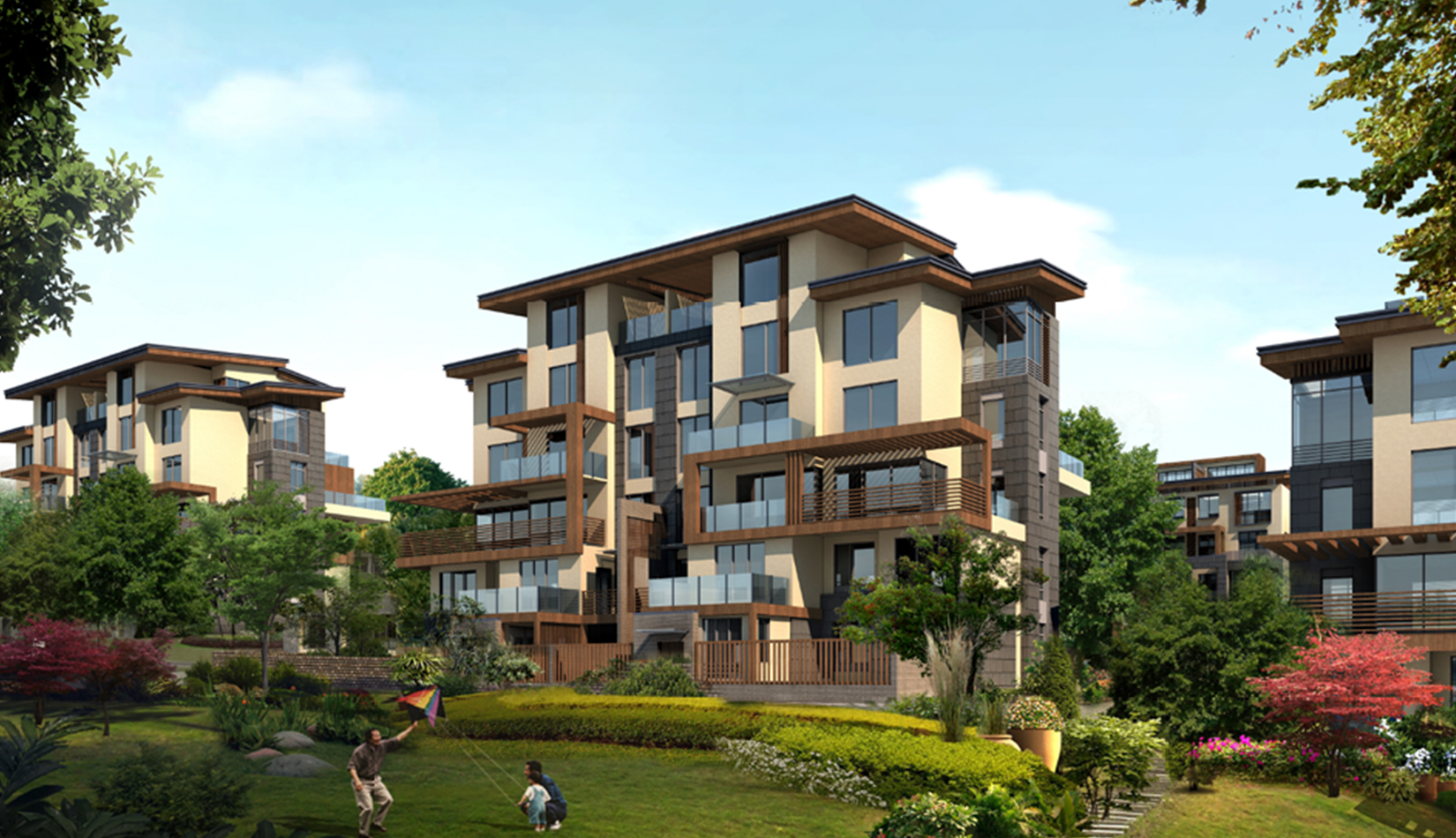 與北部組團形成對比,南面的地塊引入了一系列的圍合式院落布局。建筑物圍繞組團中心花園布局。不同的花園有不同的植物和水景主題,統(tǒng)一中包含個性。