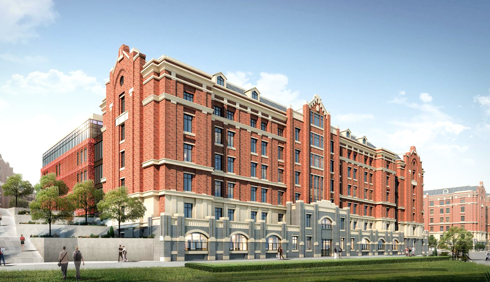 本項目位于中德生態(tài)園東側(cè),東側(cè)、南側(cè)與九中相鄰,在設(shè)計時充分考慮周邊建筑現(xiàn)狀,采用紅磚灰頂?shù)挠⑹斤L(fēng)格作為建筑立面。紅瓦灰頂,相互借勢,打造中德門戶建筑。