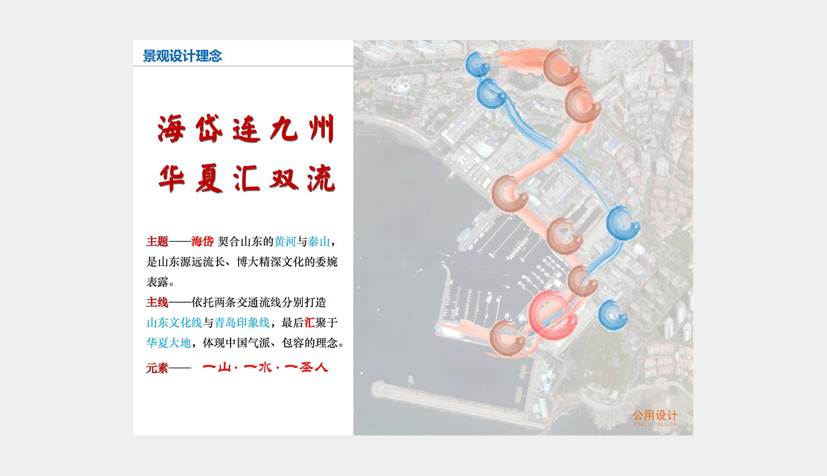 在此基礎(chǔ)上,確定迎賓動(dòng)線(xiàn)方案,完善整個(gè)區(qū)域動(dòng)態(tài)及靜態(tài)交通規(guī)劃,結(jié)合奧帆中心原有的景觀資源和山東、青島文化元素,以“海岱連九州,華夏匯雙流”為景觀設(shè)計(jì)理念,布局重要景觀標(biāo)志節(jié)點(diǎn)。