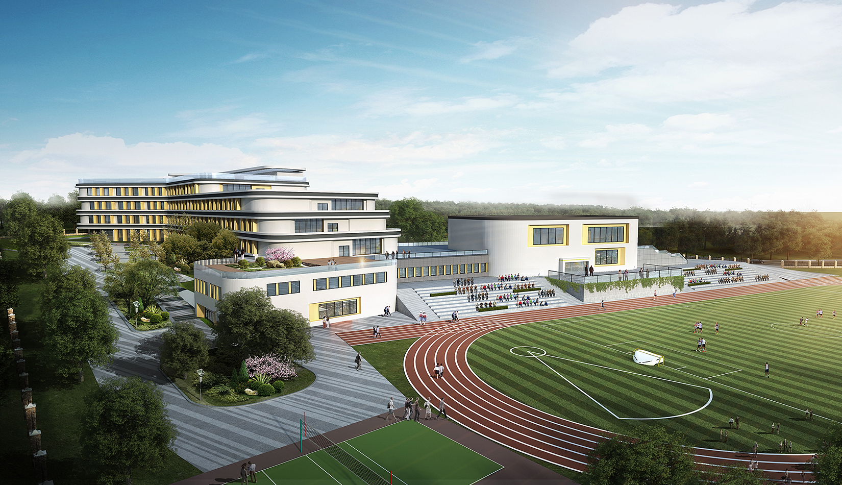 該項目設(shè)計打破傳統(tǒng)的班級串聯(lián)式學(xué)校模式,植入聯(lián)系各個功能區(qū)的中庭大空間,使用者一旦進(jìn)入,即可到達(dá)任一功能區(qū);同時該中庭大空間又是學(xué)生之間、師生之間、及學(xué)生家長們的公共自由開放式交流會面空間。